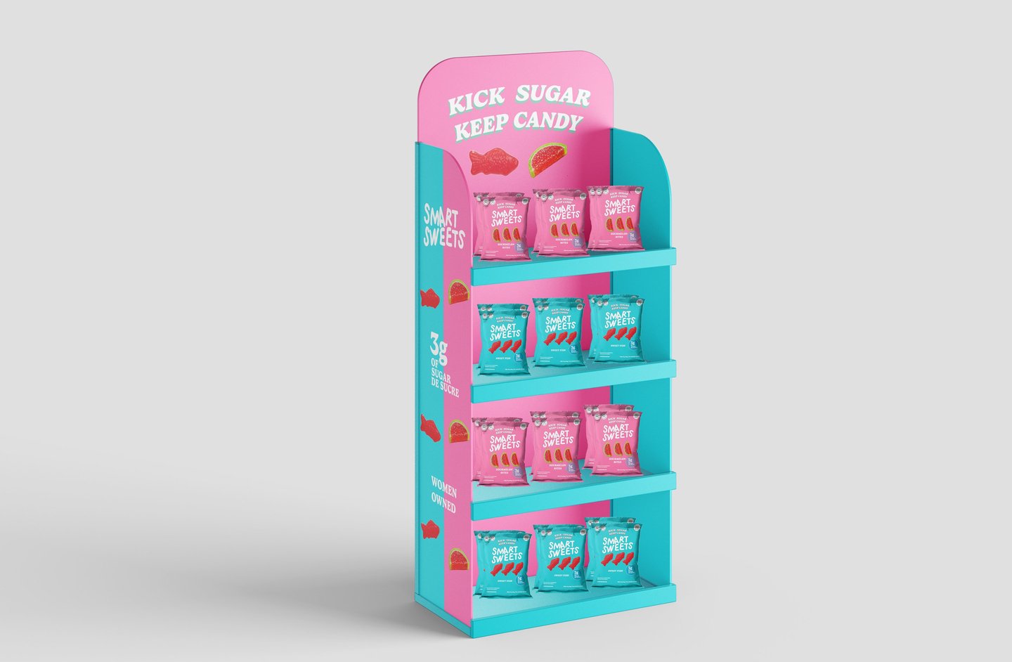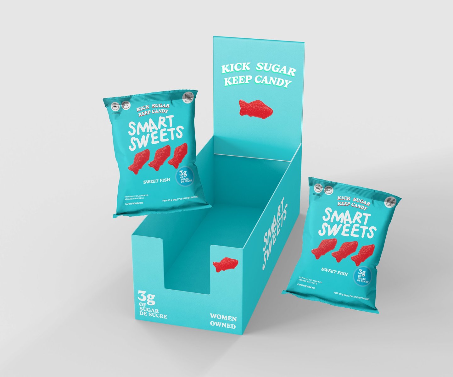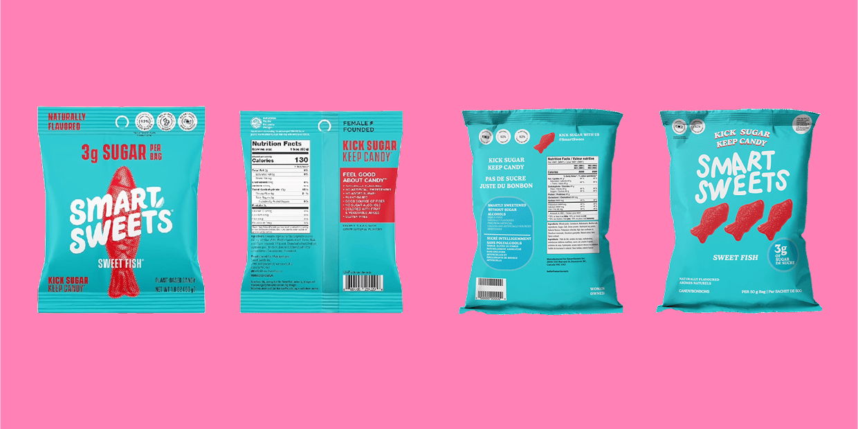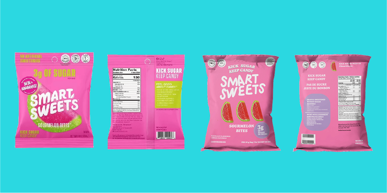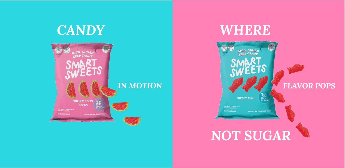 For my packaging design assignment, I redesigned SmartSweets’ Sweet Fish and Sour Melon Bites packaging to improve readability and visual hierarchy while maintaining the brand’s bold, playful aesthetic.